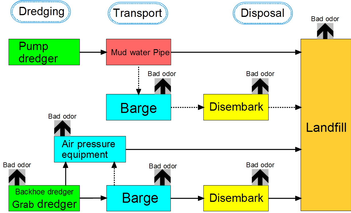 With dredging work on the water surface, the pump dredging will not generate a bad odor because the bottom sludge is sealed through the pipes but with backhoe and grab dredging, the bad odor comes out as soon as the bottom sludge emerges out of the water and out into the atmosphere. Bad odor occurs even at the time of loading the sludge into the barge and transport.